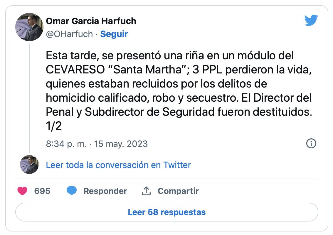 El secretario de Seguridad Ciudadana, Omar García Harfuch, confirmó que esta tarde murieron tres presos durante una riña en el módulo del Cevareso Santa Martha. Por este motivo, fueron destituidos el director del Penal y el subdirector de Seguridad. García Harfuch indicó que las personas que estaban recluidas estaban por delitos de homicidio calificado, robo y secuestro.