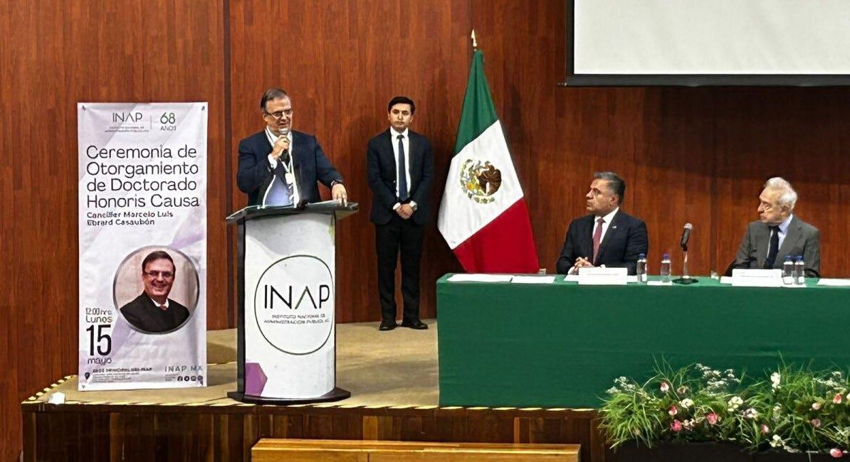 El canciller Marcelo Ebrard recibió este lunes el doctorado honoris causa por parte del Instituto Nacional de Administración Pública, como un reconocimiento a su trayectoria en el servicio público. En la ceremonia, a la que asistieron legisladores cercanos y conocidos del funcionario, el secretario de Relaciones Exteriores señaló que se debe fortalecer la administración pública basada en el mérito, y no en concesiones políticas.