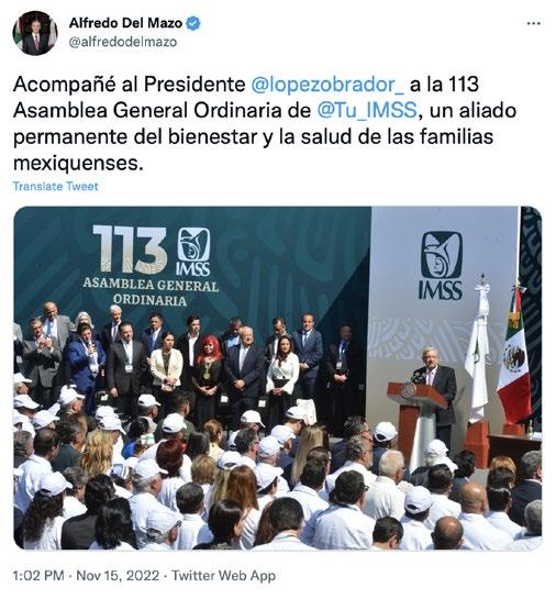 Del Mazo asiste con AMLO a la Asamblea General Ordinaria del IMSS MIÉRCOLES 16 DE NOVIEMBRE DE 2022 5 Acompañé al Presidente @ lopezobrador_ a la 113 Asamblea General Ordinaria de @Tu_IMSS, un aliado permanente del bienestar y la salud de las familias mexiquenses”