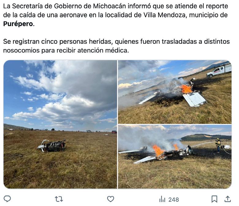Esta tarde se reportó el desplome de una aeronave Cessna 200, tratándose de un vuelo privado, según las primeras versiones dicha aeronave despegó de Guadalajara, Jalisco, con destino al estado de Puebla, sin embargo “Al Parecer” el aparato sufrió una falla que provocó el desplome en campos agrícolas de la comunidad de “Villa Mendoza”, en el municipio de Purépero, Michoacán. Las autoridades de la localidad fueron alertadas por lo que de inmediato Bomberos y elementos de Protección Civil se trasladaron al lugar del incidente y paramédicos atendieron a los cinco tripulantes (el piloto y cuatro mujeres) con lesiones por lo que fueron trasladados de inmediato a hospitales cercanos para recibir atención médica especializada.