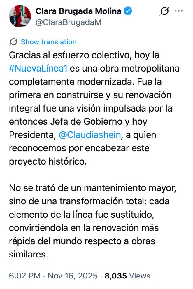 “Hoy inauguraron la nueva Línea 1 del Metro, obra que inició cuando fui jefa de Gobierno de la Ciudad de México y dieron continuidad Martí Batres y Clara Brugada. Muchas felicidades a quienes la hicieron posible en beneficio de millones de capitalinos y visitantes”, publicó en su cuenta de X, acompañando el mensaje con diversas fotografías en las que aparece junto a la jefa de Gobierno dentro del Metro.