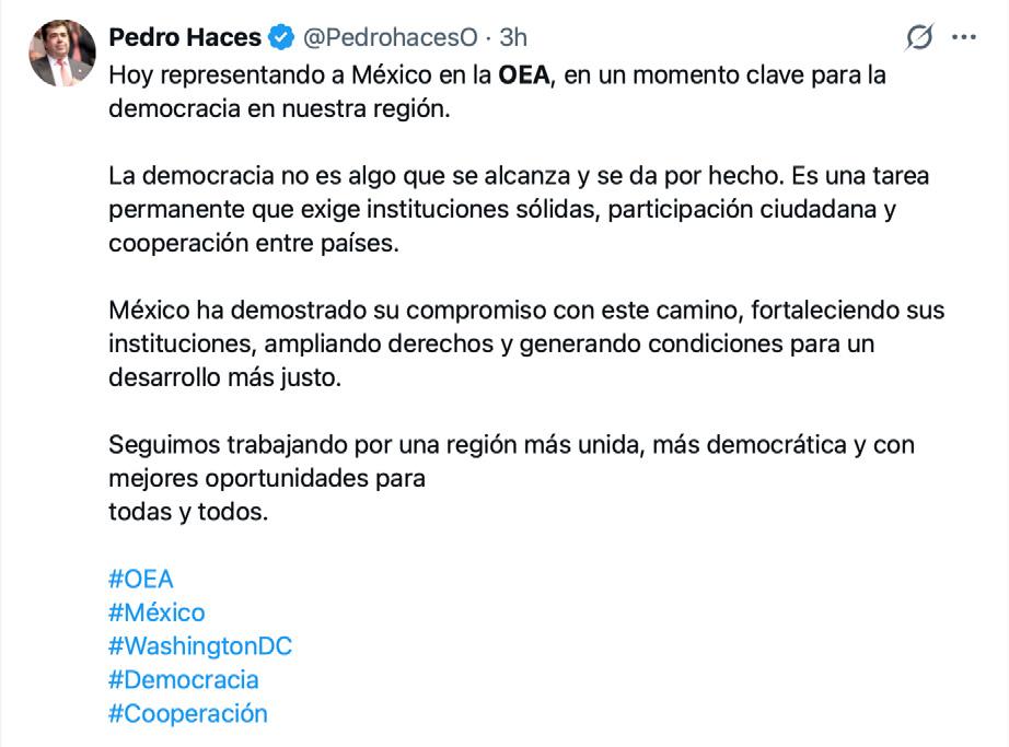 “La democracia es una tarea permanente”: Pedro Haces representa a México en la OEA