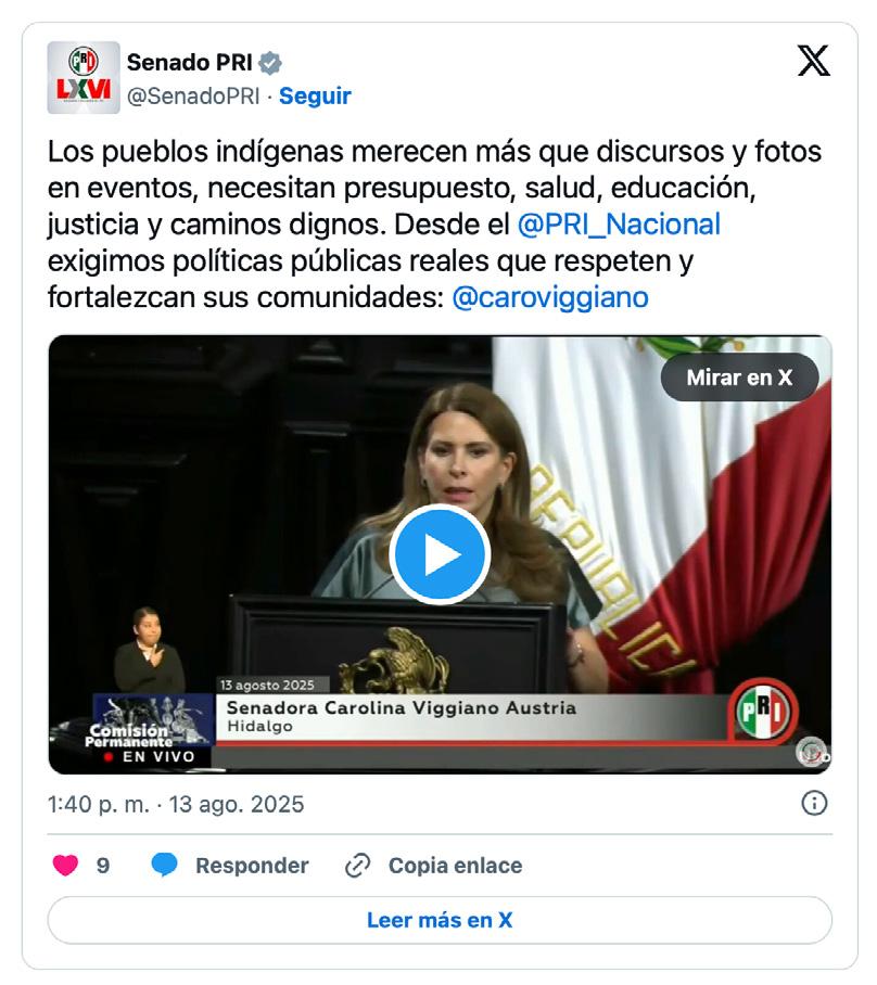 La senadora Carolina Viggiano Austria refrendó su compromiso con los pueblos indígenas y exigió al Gobierno federal dejar de tratarlos como figuras decorativas, pues “no es suficiente traerlos y mostrar sus hermosas vestimentas, bailes o artesanías, porque lo que realmente necesitan es justicia, salud e inversión”. La legisladora hidalguense llamó a atender de forma urgente las necesidades básicas de estas comunidades, con recursos para carreteras, puentes, universidades, agua potable, drenaje y electrificación, que dignifiquen sus condiciones de vida. Recordó que en gobiernos anteriores, cuando existía un presupuesto específico para pueblos originarios, hubo avances significativos, especialmente en salud y educación; no obstante, reconoció que aún hay una deuda pendiente con estas comunidades.