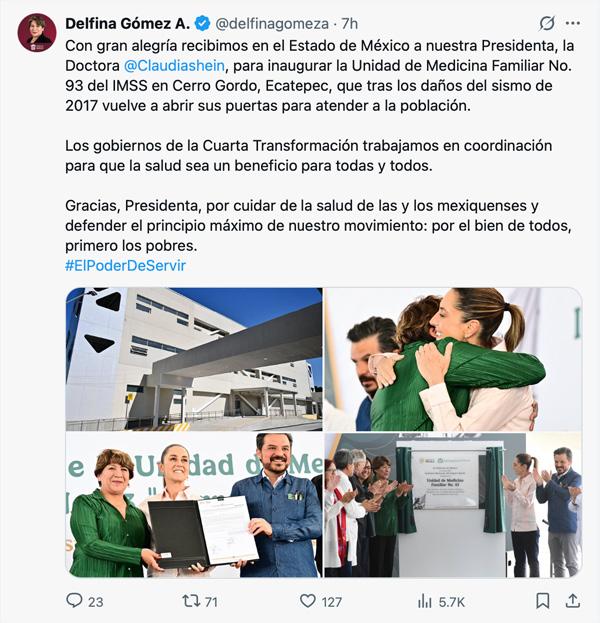 • La presidenta de México, Claudia Sheinbaum Pardo, y la gobernadora del Estado de México, Delfina Gómez Álvarez inauguraron la clínica 93 del IMSS en Ecatepec, Estado de México