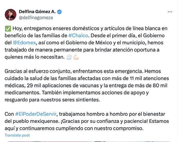 La Gobernadora del Estado de México, Delfina Gómez Álvarez, encabezó la entrega de enseres domésticos para más de 1,800 familias de Chalco, afectadas por las intensas lluvias que impactaron la región