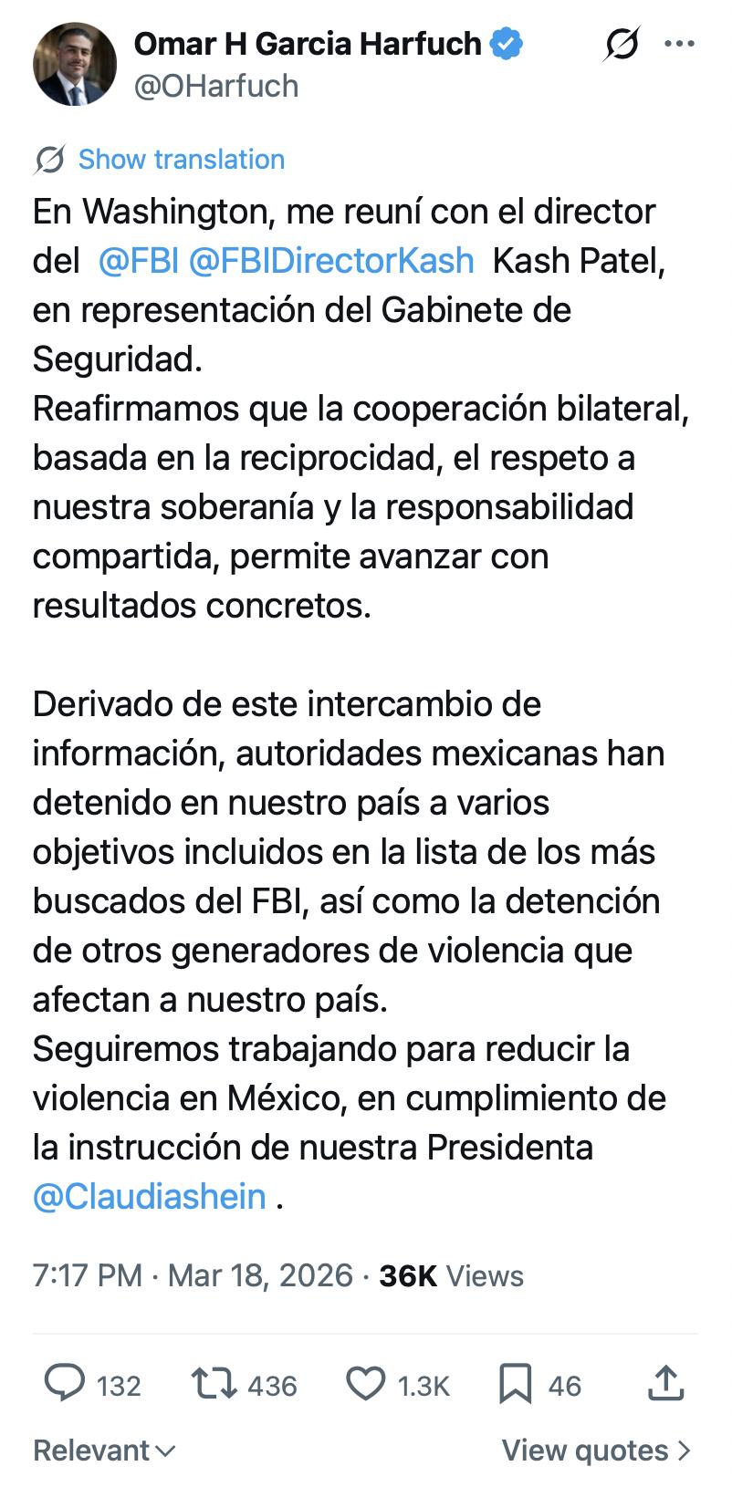 Omar García Harfuch se reunió con Kash Patel, director del Buró Federal de Investigaciones (FBI) en Washington, Estados Unidos. A través de redes sociales informó que acudió como representante del Gabinete de Seguridad de México para tratar temas de interés binacional.