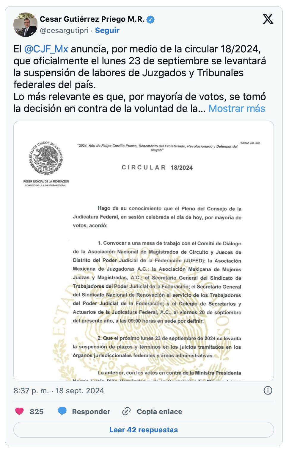 El Consejo de la Judicatura Federal (CJF) acordó que a partir del lunes 23 de septiembre todos los juzgados de distrito y tribunales de circuito reanudarán sus actividades y los plazos y términos legales de sus procedimientos. Por cinco votos contra dos, los consejeros votaron en la sesión del Pleno de este miércoles en favor de reanudar las labores, luego de que el 21 de agosto pasado los impartidores de justicia federales iniciaron un paro indefinido en protesta por la reforma al Poder Judicial. La Asociación Nacional de Magistrados de Circuito y Jueces de Distrito del Poder Judicial de la Federación (Jufed) pidió el martes al Consejo de la Judicatura Federal instalar una mesa de diálogo para garantizar los derechos laborales de los trabajadores judiciales, como condición previa para levantar la suspensión de actividades.