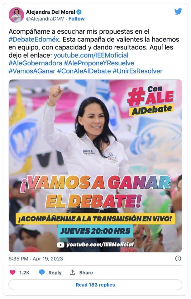 viables, ganaremos el primer debate por la gubernatura del Estado de México este jueves, afirmó Alejandra Del Moral Vela, abanderada de la coalición del PRI, PAN, PRD y Nueva Alianza. “Con educación, con conocimiento, pero sobre todo, con un gran amor a esta tierra y con altura de miras”, se va a ganar el debate y la próxima elección, aseguró la candidata de Va por el Estado de México a los vecinos que han acudido a sus concentraciones de campaña.