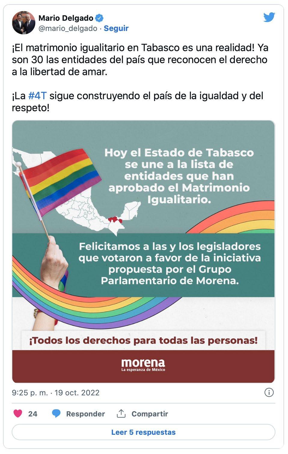 informó Emilio Contreras Martínez, diputado pre sidente del Congreso de Tabasco. Con dicha medida, sólo Guerrero y Tamaulipas siguen sin avalar el matri monio igualitario. Los artículos reformados son el 116, fracción I; el 153, segundo párrafo; los 154, 216, 217, 269, párrafo segundo, fracción III; el 285, párrafos pri mero y segundo; así como los 289 y 3 mil 275. La ini ciativa fue presentada desde el pasado 12 de octubre por el diputado, Jesús Díaz, de la bancada de Morena, argumentando que 29, de las 32 entidades del país, ya habían legislado al respecto, por lo que era adecuado hacer la reforma. Además, también señaló que la sociedad ha cambiado, por lo que en la actualidad no solo se encuentran familias tradicionales; por lo que es obligación del Estado proteger a las nuevas uniones, y darles certeza, seguridad y legalidad jurídica.