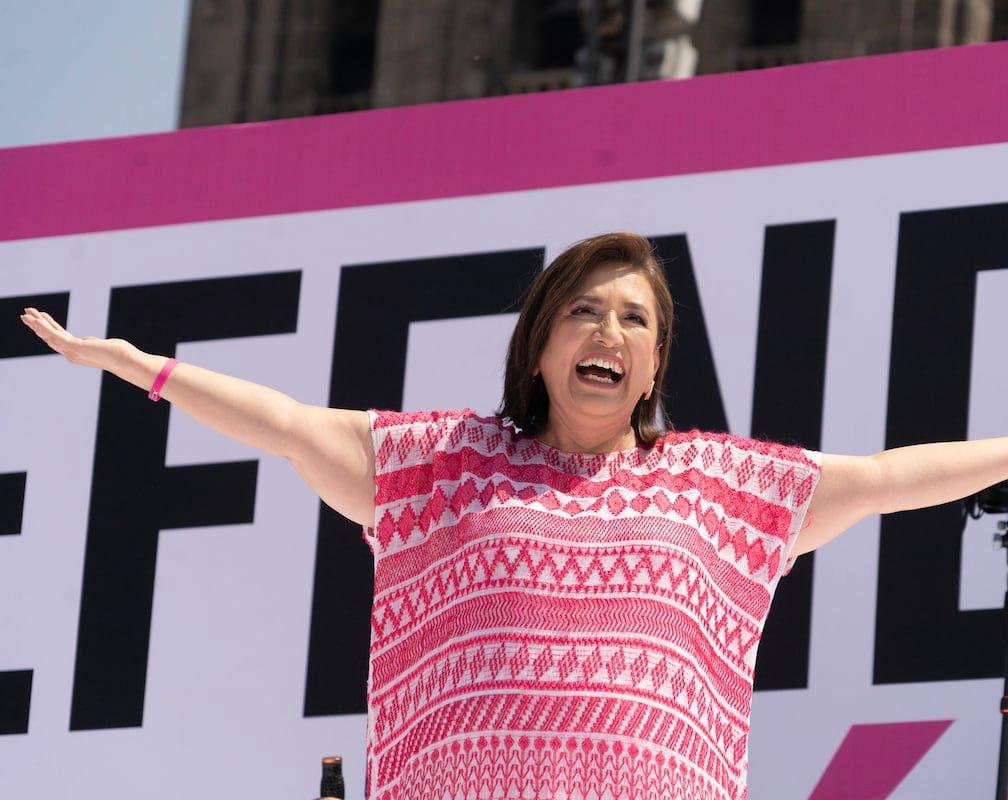 Miles de personas se dieron cita este domingo en el Zócalo de Ciudad de México para gritar por la democracia, protestar contra el Gobierno de Andrés Manuel López Obrador y apoyar a Xóchitl Gálvez. Después de una semana de tensiones y polémica, la Marea Rosa ha salido a las calles para respaldar, por primera vez de forma abierta, a la candidata de la oposición por la presidencia. “Antes que partido, tenemos patria”, afirmó Gálvez ante la multitud. “Antes que partido, tenemos república, tenemos democracia, tenemos a México”, agregó la abanderada de la coalición Corazón y Fuerza por México entre gritos de “¡Presidenta, presidenta” y “Fuera Morena”. La plaza más icónica del país se volvió a teñir de rosa, pero también de azul, rojo y amarillo, los colores del PAN, PRI y PRD, los partidos que la postulan. La concentración masiva llegó en un momento crítico: apenas horas antes del tercer y último debate presidencial, diez días antes del cierre de las campañas y a dos semanas de las votaciones. “Vamos adelante, vamos sin miedo, hombres y mujeres libres, vamos por la victoria”, afirmó Gálvez, en un templete colocado frente a la catedral. “Vamos a ganar para abrir la puerta de Palacio Nacional para todos los mexicanos”, dijo sobre la sede del Gobierno, que le quedaba del lado izquierdo y que se convirtió en una trinchera rodeada de altas vallas metálicas para evitar que se acercaran los manifestantes, como suele suceder en las marchas y protestas en la capital. Es la cuarta convocatoria de la Marea Rosa, que hasta hace unos días se definía como neutral y apartidista, y que hoy ha hecho pública su simpatía por la candidata del frente opositor. “Fuera máscaras”, dijo esta semana el presidente López Obrador, el blanco de todas las consignas. Desde la perspectiva del oficialismo y la oposición es momento de definiciones: hay dos modelos políticos, dos proyectos del país, dos candidatas que aspiran a ser la primera presidenta del país, Gálvez o Claudia Sheinbaum, de Morena.