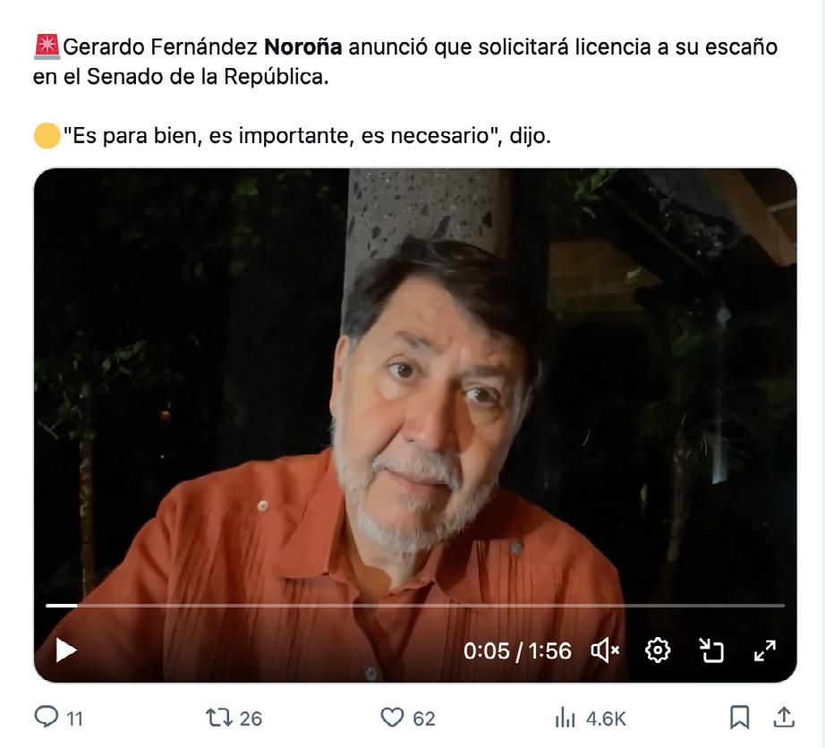 El senador Gerardo Fernández Noroña anunció durante una transmisión en vivo que solicitará licencia temporal a su cargo en el Senado de la República. La declaración, realizada a través de redes sociales, generó expectativa sobre los motivos específicos de esta decisión.