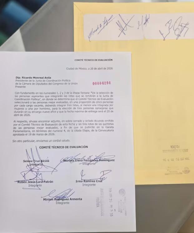“Hace unos minutos, la secretaria técnica de la JUCOPO recibió del Comité Técnico de Evaluación las quintetas de personas que se considerarán para ocupar las vacantes del INE. A las 22:00 h nos reuniremos la y los coordinadores parlamentarios para conocerlas y publicarlas”