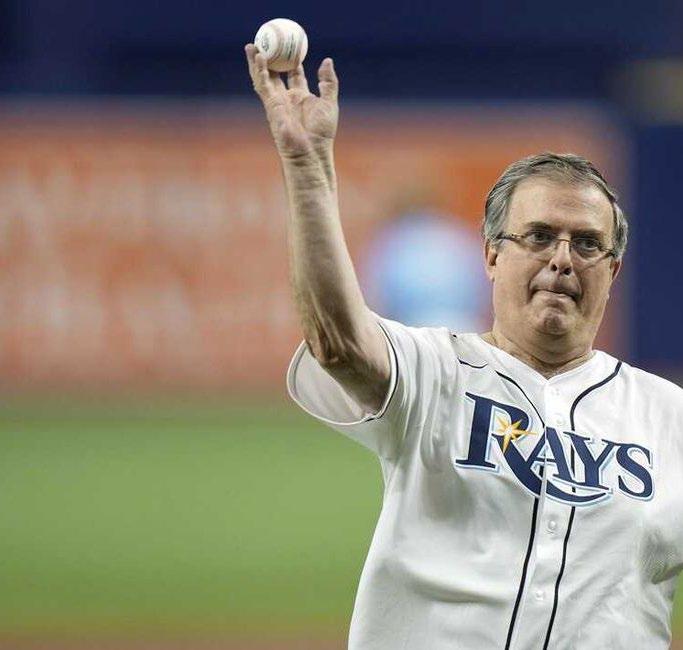De gira de trabajo por Florida, Estados Unidos, el canciller Marcelo Ebrard Casaubón lanzó la primera bola en el partido de Grandes Ligas entre las Rayas de Tampa Bay y los Cerveceros de Milwaukee.