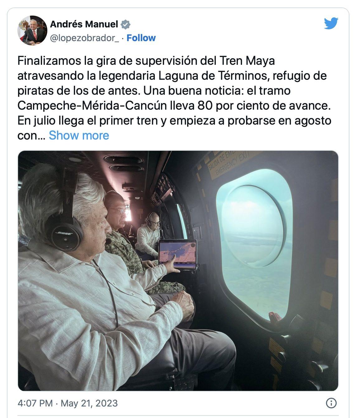 “Finalizamos la gira de supervisión del Tren Maya atravesando la legendaria Laguna de Términos, refugio de piratas de los de antes. Una buena noticia: el tramo Campeche-MéridaCancún lleva 80 por ciento de avance. En julio llega el primer tren y empieza a probarse en agosto con desplazamientos de hasta 180 kilómetros por hora”, escribió en la red social.