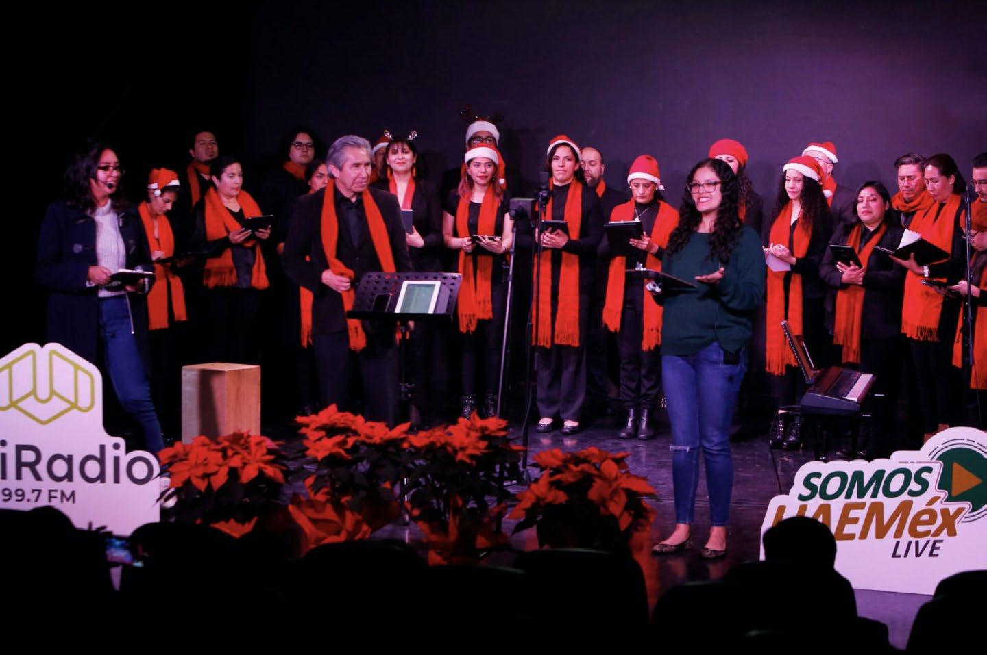 El Coro Universitario de la Universidad Autónoma del Estado de México (UAEMéx) celebró la temporada decembrina con el “Concierto Navideño” con música sacra y villancicos, a través del programa de UniRadio 99.7 FM “Somos UAEMéx Live”, que se disfrutó en vivo en el Teatro de Cámara “Esvón Gamaliel” y con transmisión en Facebook, para el deleite de las audiencias.