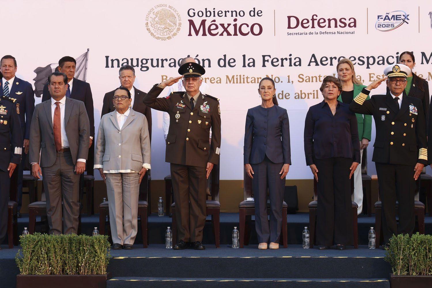 La Gobernadora del Estado de México, delfina Gómez, acudió este Martes 22 de abrila la inauguración de la Sexta Feria Aeroespacial de México 2025. Acompañada del secretario de la Defensa Nacional, Ricardo Trevilla Trejo, funcionarios federales y varios gobernadores, entre ellos los estados