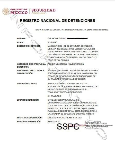 Martí, en Durango. Al momento de su aprehensión, Óscar Alejandro —también identificado con el alias de ‘El Güero’— vestía una playera tipo polo de color negro con rosa, un pantalón de mezclilla de color azul y tenis grises. Asimismo, fue descrito como un masculino de complexión mediana, ojos verdes y un tatuaje en el pecho con el nombre de “María Berthina”. A mediados de agosto, una joven de 23 años de edad de identidad reservada denunció a través de redes sociales que había sido víctima de una agresión sexual por parte del regidor de Metepec. Los hechos habrían ocurrido el 10 de agosto. En un principio, la joven se reunió con su prima y unos amigos en el restaurante Pura Vida de Metepec. Al lugar llegó Óscar Alejandro “N”, quien era conocido por uno de los presentes. Posteriormente optaron por trasladarse al bar Los Cantaritos, ubicado en la avenida Lerma. La joven subió a su camioneta en compañía de Óscar Alejandro, quien durante el trayecto se desvió hacia una zona de terracería para abusar de ella. “Yo me comienzo a asustar y le pido que regrese. Él no me hace caso, sólo me ignora y pone seguro en la camioneta, comienza a desabrochar su pantalón. Yo intento mandar mensaje a mi prima y en ese momento se lanzó sobre mí”, relató la joven. Tras una serie de forcejeos, la joven pudo escapar del lugar y solicitar ayuda. Fue así como arribaron elementos de la policía municipal, quienes la escoltaron a la Fiscalía de Género en Toluca para denunciar los hechos.