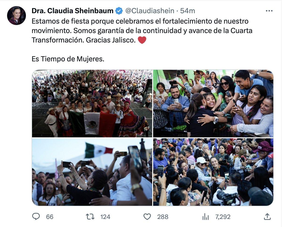En su discurso, la ex jefa de Gobierno de la Ciudad de México recordó que el camino de la Cuarta Transformación también significa que hoy es tiempo de mujeres, pues aseguró que ocho de cada 10 mexicanos y mexicanas prefieren que sea una mujer la que esté al frente de las decisiones que se toman en el país, esto según diferentes encuestas que han sido publicadas desde hace unos meses. “Además de 4T, es tiempo de mujeres, no quiere decir que por ser tiempo de mujeres ya no es tiempo de hombres, o que por ser tiempo de mujeres ya no es tiempo de la diversidad, es tiempo de todas y todos los mexicanos, particularmente de todo el pueblo de México”, reiteró. Recordó que la transformación del país, que comenzó con la llegada del presidente Andrés Manuel López Obrador, no puede terminarse, pues es gracias a este movimiento que se han impulsado programas sociales como becas para jóvenes o la pensión para los adultos mayores. Asimismo, proyectos de alto impacto como el Tren Maya y la Planta Solar de Sonora, por lo que consideró necesario dar continuidad a estos proyectos e ir más allá para generar riquezas compartidas y que de esta manera sean cada vez más los mexicanos que salen de la pobreza.