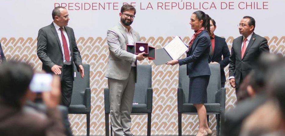 La jefa de Gobierno, Claudia Shein baum, nombró huésped distinguido al presidente de Chile, Gabriel Boric, a quien también entregó las llaves de la Ciudad de México. En la ceremonia, Sheinbaum destacó que son varios los aspectos que hermanan a ambas naciones como el respecto a los dere chos humanos y la memoria.