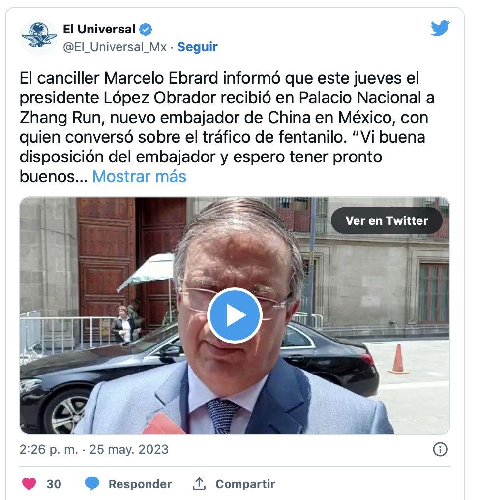 Marcelo Ebrard Casaubón, secretario de Relaciones Exteriores (SRE), informó que este jueves el presidente Andrés Manuel López Obrador recibió en Palacio Nacional a Zhang Run, nuevo embajador de China en México, donde conversó sobre el tráfico de fentanilo y donde, afirmó, hay “una gran cooperación y la vamos a mantener”. En entrevista afuera de Palacio Nacional luego que López Obrador recibiera las cartas credenciales de siete embajadores, el canciller aseguró que hay disposición del embajador chino para abordar este tema. “En el caso de China estamos avanzando mucho en varios convenios en materia policial, en torno al tema de los precursores químicos, hay una gran cooperación con China y la vamos a mantener”, comentó. “¿El presidente dijo algo al diplomático de China sobre el tema del fentanilo?”, se le preguntó.