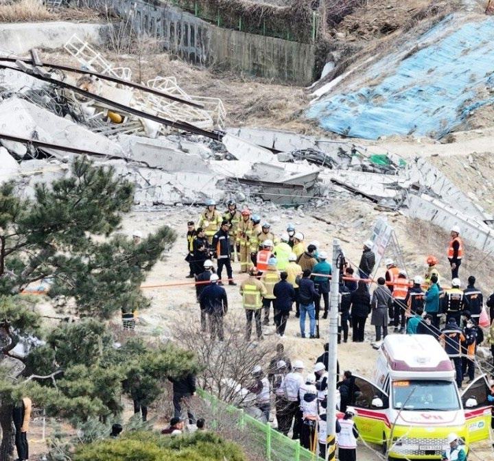 El accidente ocurrió alrededor de las 9:49 hora local, en un puente en construcción que conecta la sección Ansan-Yongin de la autopista Seoul-Sejong. Durante las labores de construcción, 50 metros de vigas de acero colapsaron, provocando el derrumbe de una parte de la infraestructura. Según informaron las autoridades este