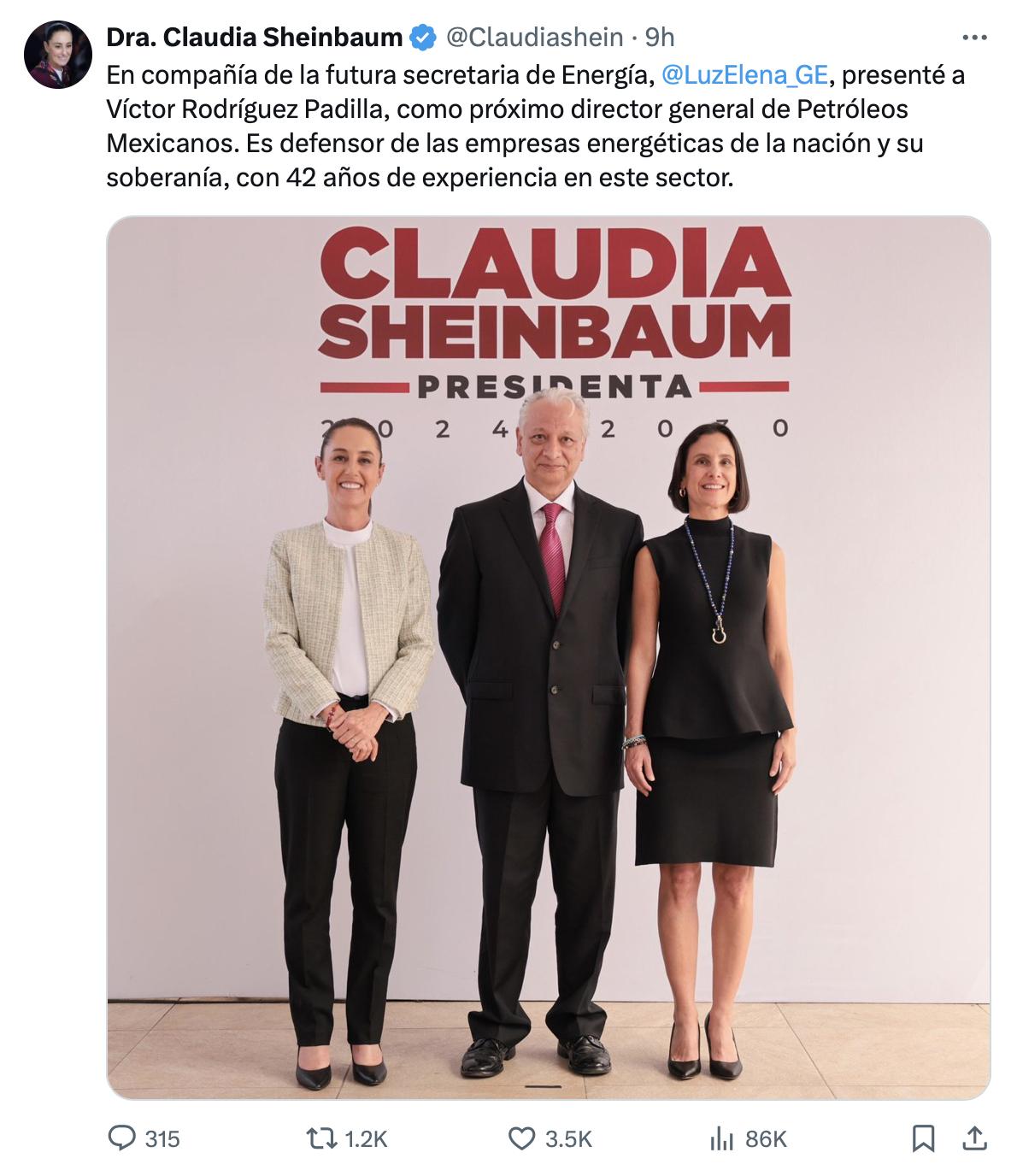 Claudia Sheinbaum alista a Víctor Rodríguez Padilla como nuevo director de Pemex