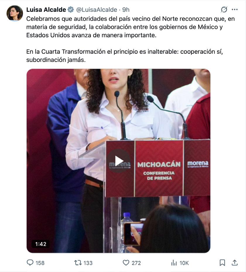Luisa María Alcalde aseguró que la postura de las autoridades estadounidenses sobre Genaro García Luna acreditan como un narcogobierno al que presidió Felipe Calderón