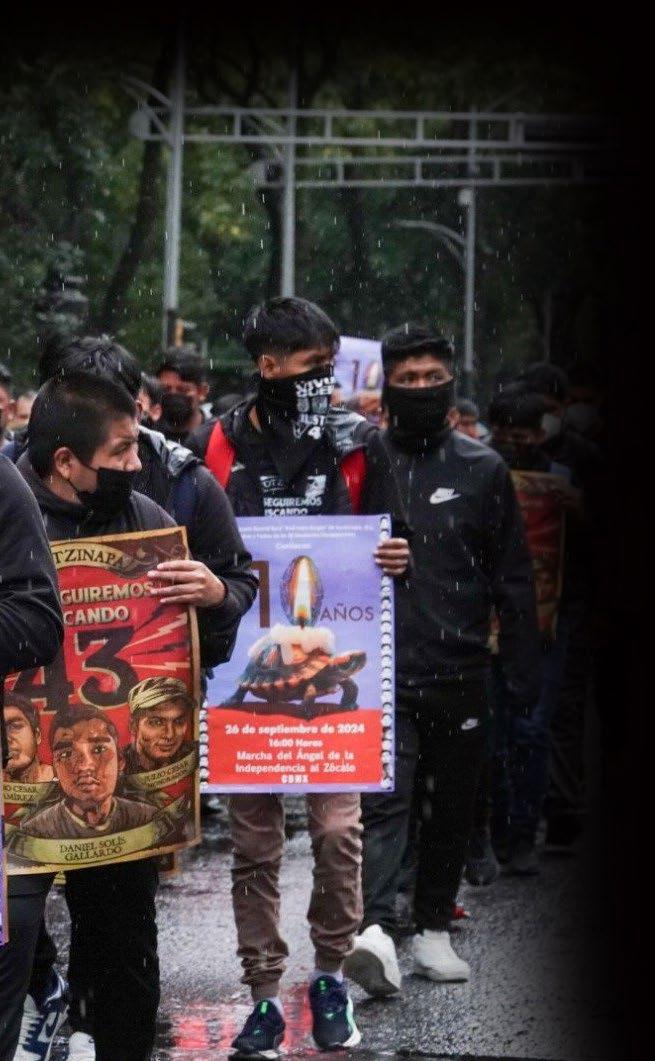 Acompañados por la lluvia y el mal clima que persiste en la Ciudad de México, los primeros colectivos que se reunieron en el Ángel de la Independencia han comenzado su marcha hacia el Zócalo. Algunos activistas han realizado pintas en estaciones del Metro y Metrobús para exigir justicia por los normalistas desaparecidos hace 10 años y demandar que el Gobierno realmente resuelva el caso.