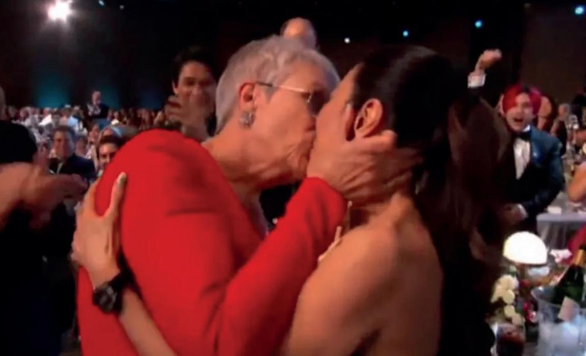 Jamie Lee Curtis le planta tremendo beso a Michelle Yeoh tras ganar el SAG a mejor actriz de reparto