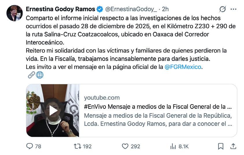 La fiscal general de la República, Ernestina Godoy, informó este martes 27 de enero que, tras las investigaciones realizadas por la dependencia federal, que el descarrilamiento del Tren Interoceánico se debió al exceso de velocidad. En conferencia de prensa, explicó que el accidente, que ocurrió hace casi un mes y que dejó 14 muertos, se debió a que el ferrocarril iba a 15 kilómetros por encima del límite autorizado en el lugar del descarrilamiento. Resaltó que se está analizando ejercer acción penal por homicidio culposo y lesiones culposas contra los implicados en el descarrilamiento. Godoy aseguró que desde el día del accidente, el 28 de diciembre, la FGR abrió la carpeta de investigación y desplegó personal ministerial, peritos y policías federales ministeriales al lugar del accidente, con el objetivo de atender a las víctimas, preservar indicios y esclarecer las causas del siniestro ocurrido en el Corredor Interoceánico del Istmo de Tehuantepec.