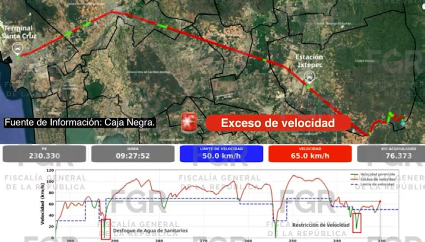 De acuerdo con la información extraída de la caja negra de la locomotora, el tren circulaba a 65 kilómetros por hora en la curva donde ocurrió el descarrilamiento, pese a que la velocidad máxima autorizada era de 50 km/h para el servicio de pasajeros en ese tramo. Además, los registros revelaron que, en tramos rectos previos, el tren alcanzó velocidades de hasta 111 km/h, cuando el límite permitido era de 70 km/h, lo que implicó una circulación 41 km/h por encima de lo autorizado. La fiscal explicó que la caja negra es un dispositivo tecnológico de alta confiabilidad e inalterable, que registra velocidad, ubicación, frenado y eventos de supervisión, información que fue debidamente extraída con cadena de custodia por peritos especializados.