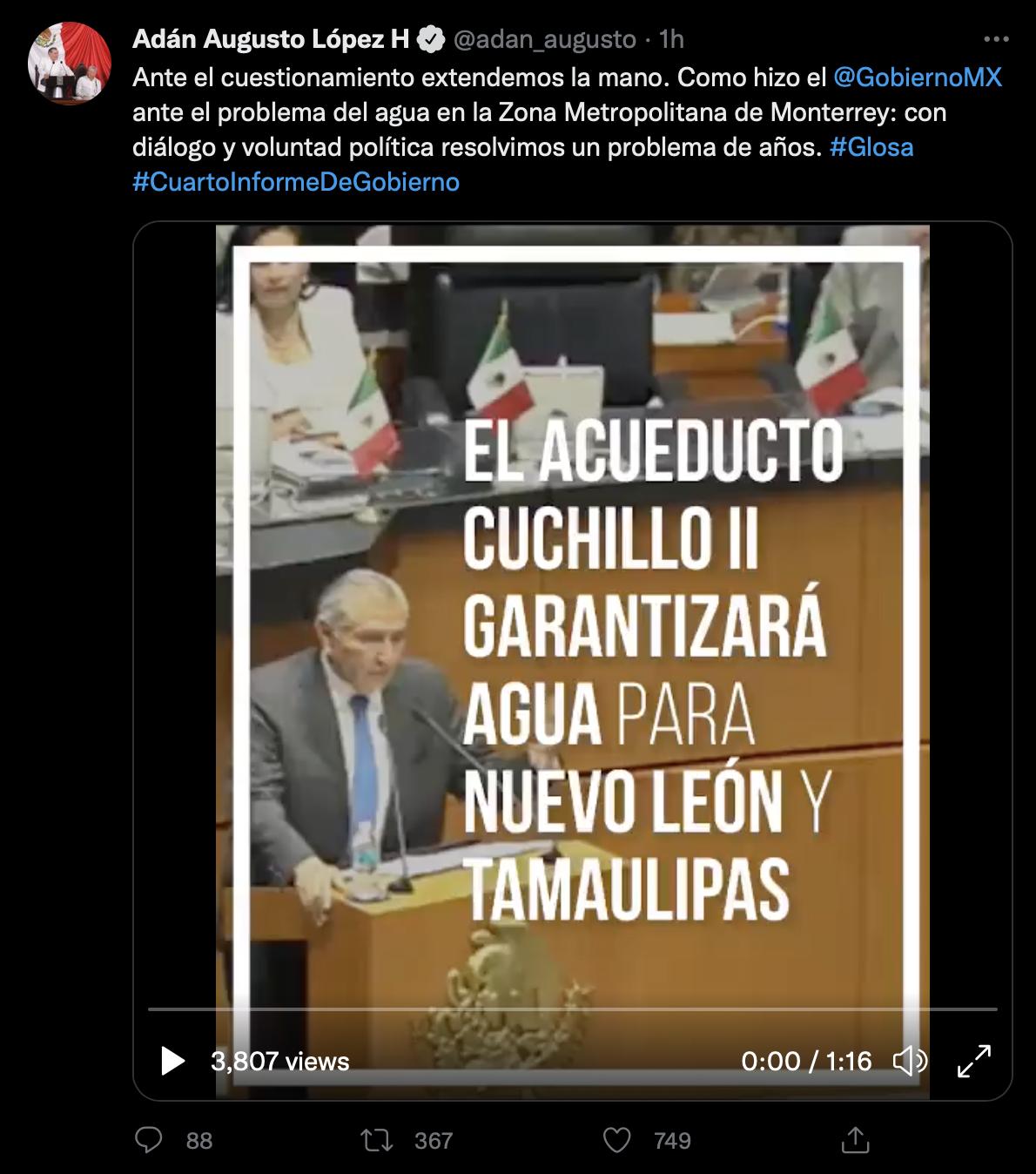 El secretario de Gobernación, Adán Augusto López, ofreció al Senado de la República apertura de esa dependencia para construir la gobernabilidad que el país nece sita. Durante su intervención inicial ante el pleno senato rial donde no se refirió al ejercicio participativo donde se preguntará a la ciudadanía sobre el tema de que las fuer zas armadas sigan en labores de seguridad hasta 2028, ni tampoco a la reforma constitucional en ese tema, destacó temas como el combate a la pandemia y a la inflación. Destacó que los tres poderes de la Unión debemos ensan char los caminos de diálogo y negociación, sin diatribas, ni descalificaciones personales.