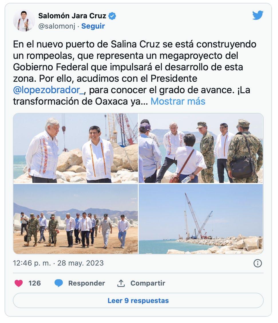 El presidente Andrés Manuel López Obrador supervisó los trabajos de modernización de nuevo Puerto de Salina Cruz, Oaxaca. Acompañado por el secretario de Marina, almirante José Rafael Ojeda Durán y por el gobernador de Oaxaca, Salomón Jara (Morena), el titular del Ejecutivo también revisó los avances en la construcción del rompe olas del nuevo puerto de Salina Cruz. El gobernador Jara, por medio de sus redes sociales, dio a conocer algunos detalles de la gira del titular del Ejecutivo federal.