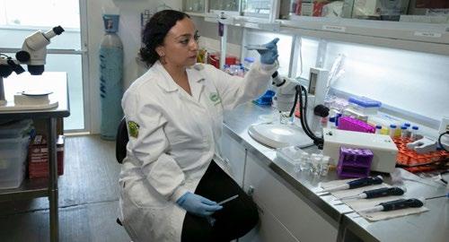 de daño a la médula espinal, entonces tendría que generarse en mayor cantidad y haber una mayor expresión de Fz7”, explicó la investigadora. La propuesta de investigación surgió cuando García Morales realizó su doctorado en el Reino Unido, utilizando como modelo a la rana Xenopus laevis, mejor conocida como la rana de uñas africanas, para estudiar los genes Fz7 y Fz9. Al realizar la inyección de ambos genes en embriones y aplicar una técnica para la detección de RNA con una reacción de color (hibridación in situ), notó una expansión en la médula espinal con el gen Fz7, por lo que decidió aplicar sus estudios en el pez cebra (Danio rerio), especie conocida por su capacidad de regeneración incluso en la etapa adulta, con el fin de comprobar si efectivamente Fz7 tenía un papel relevante. Los resultados encontrados hasta el momento, aplicando técnicas moleculares como la RT-PCR para la transcripción de la información genética del RNA y la PCR para copiar un fragmento de la cadena de interés, han sido que se detecta la expresión de Fz7, principalmente en la etapa embrionaria del pez cebra, mientras que en la etapa adulta va desapareciendo. No obstante, la investigadora comenta que se requiere repetir el procedimiento, con el fin de comprobar los resultados contundentemente. M