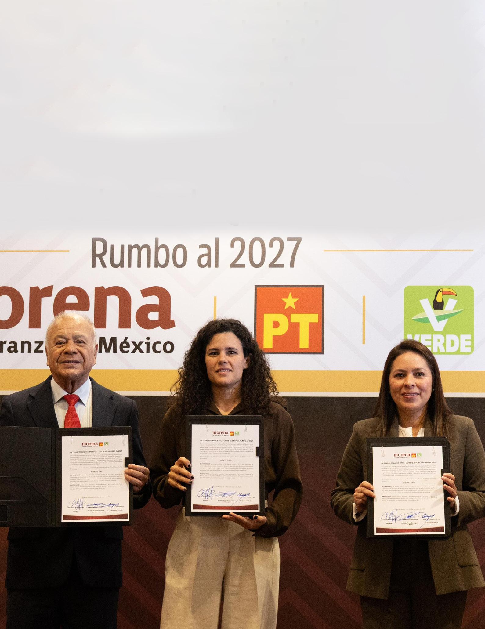 Los partidos de la alianza, Morena, PT y Partido Verde firmaron una declaración conjunta en la que priorizan la unidad de su movimiento y el proyecto de nación de la presidenta Claudia Sheinbaum, rumbo a la elección intermedia de 2027; sin embargo, miembros del Partido del Trabajo se rehusaron a hablar sobre la reforma electoral al firmar que no existe una propuesta ya hecha ante el Congreso. En un hotel de la Ciudad de México, los líderes de estos tres partidos: Luisa María Alcalde, presidenta nacional de Morena; Karen Castrejón, dirigente nacional del Partido Verde; y Alberto Anaya, líder vitalicio del Partido del Trabajo, aseguraron que “por encima de cualquier interés de partido, estará el interés de México y del proyecto de nación”. Además de mantener la alianza para 2027, elección en la que se elegirá de nuevo la Cámara de Diputados,