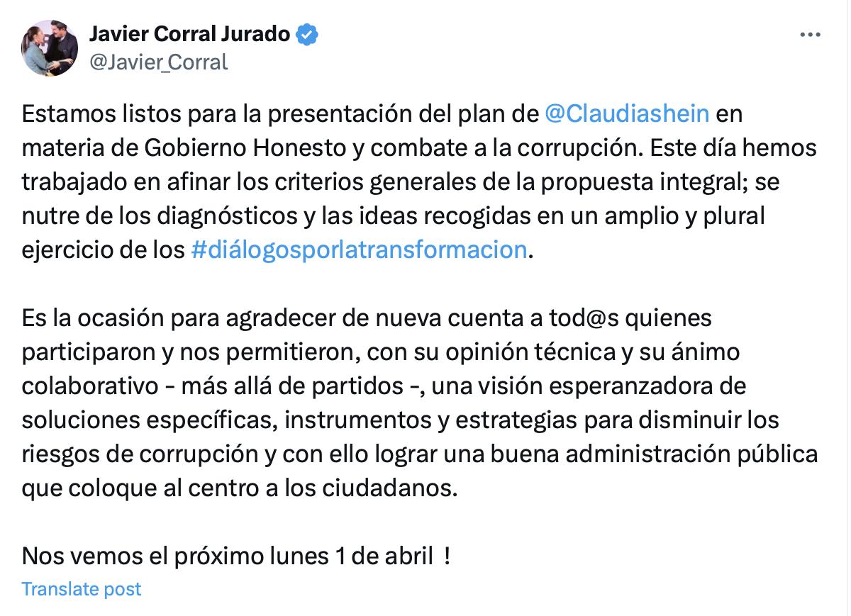 “Estamos listos para la presentación del plan de @Claudiashein en materia de Gobierno Honesto y combate a la corrupción. Este día hemos trabajado en afinar los criterios generales de la propuesta integral; se nutre de los diagnósticos y las ideas recogidas en un amplio y plural ejercicio de los #diálogosporlatransformacion”, escribió Javier Corral en su cuenta de X.