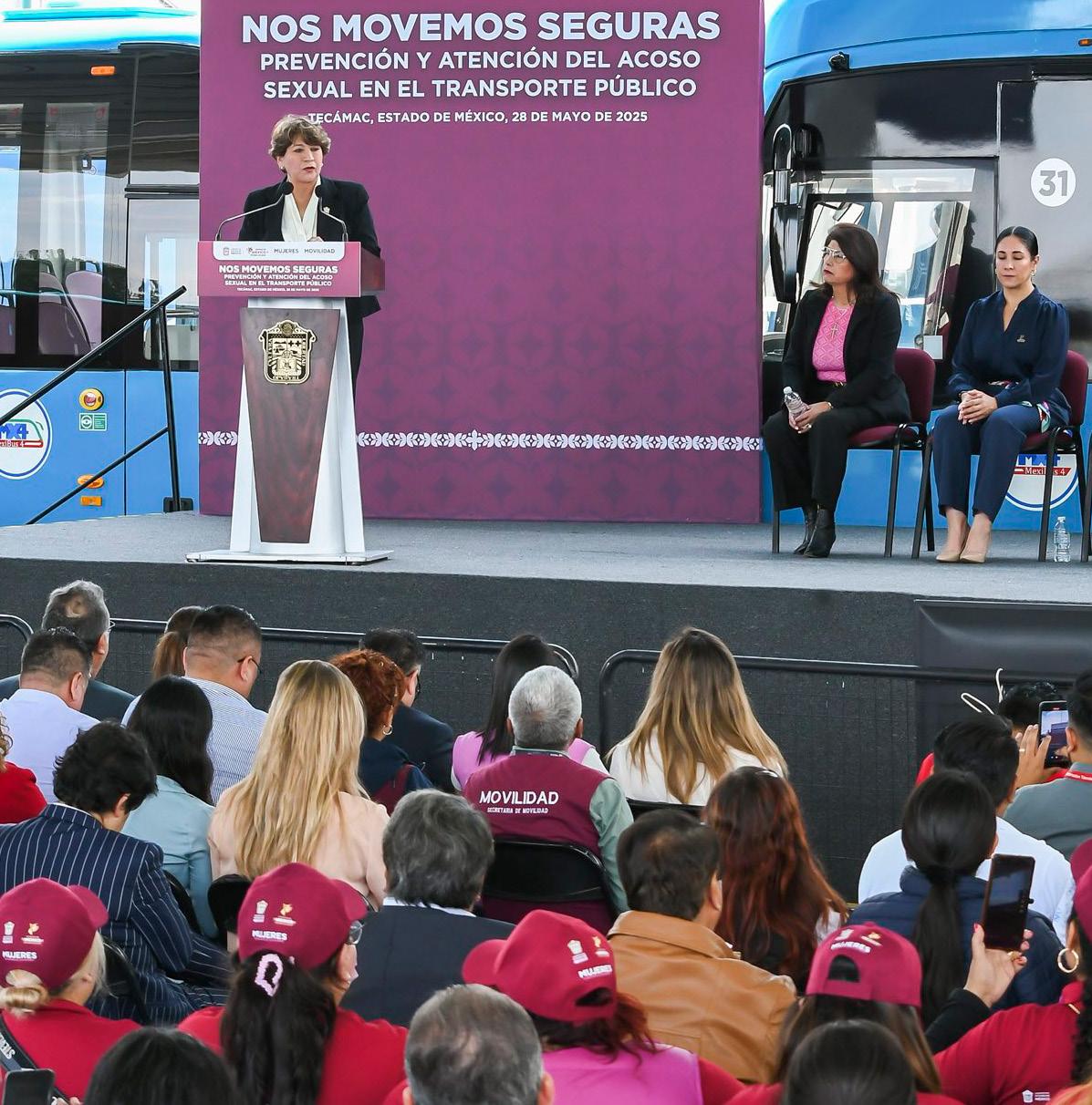 Acompañada de Citlalli Hernández Mora, Secretaria de las Mujeres del Gobierno Federal, la Mandataria estatal explicó que, adicionalmente, se están tomando medidas preventivas como asignar asientos especiales para mujeres y limitar el acceso de personas en estado agresivo. Este protocolo se aplicará no solo en el transporte, sino también en lugares públicos. Durante el evento efectuado en la terminal UMB de la Línea 4 del Mexibús en el fraccionamiento de Los Héroes, Tecámac, la Maestra Delfina Gómez Álvarez dio a conocer los detalles de este programa.