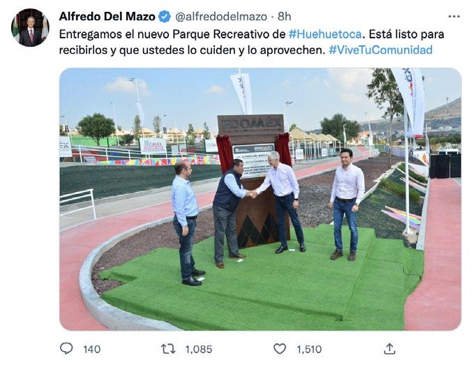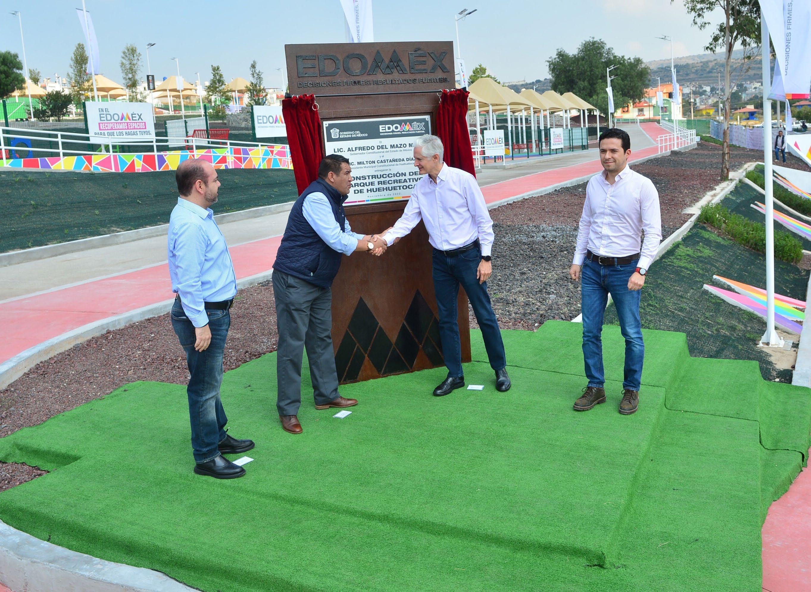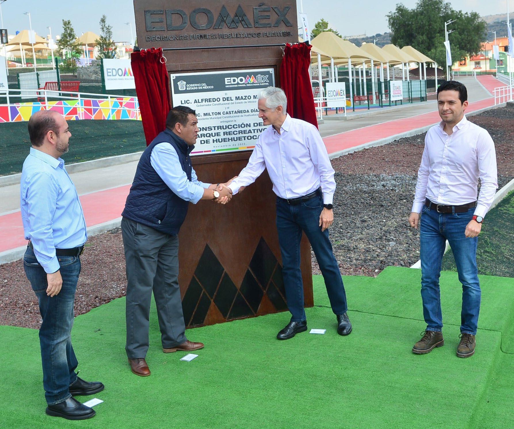 El Gobernador Alfredo Del Mazo Maza, realizó la entrega del Parque Recreativo de Hue huetoca, el cual, forma parte de los 74 espacios públicos que el Gobierno estatal ha recu perado en todo el Estado de México, para que las familias tengan a su alcance lugares seguros, donde los jóvenes puedan convivir o practicar algún deporte. “Me da mucho gusto que estemos haciendo entrega de un deportivo más, de un parque más como los que estamos entregando en todo el Estado de México. Hoy con éste ya son 74 espacios deportivos, recreativos que construimos para que las familias tengan un área de convi vencia, de recreación, de venir a pasear en familia”.Señaló el mandatario estatal.