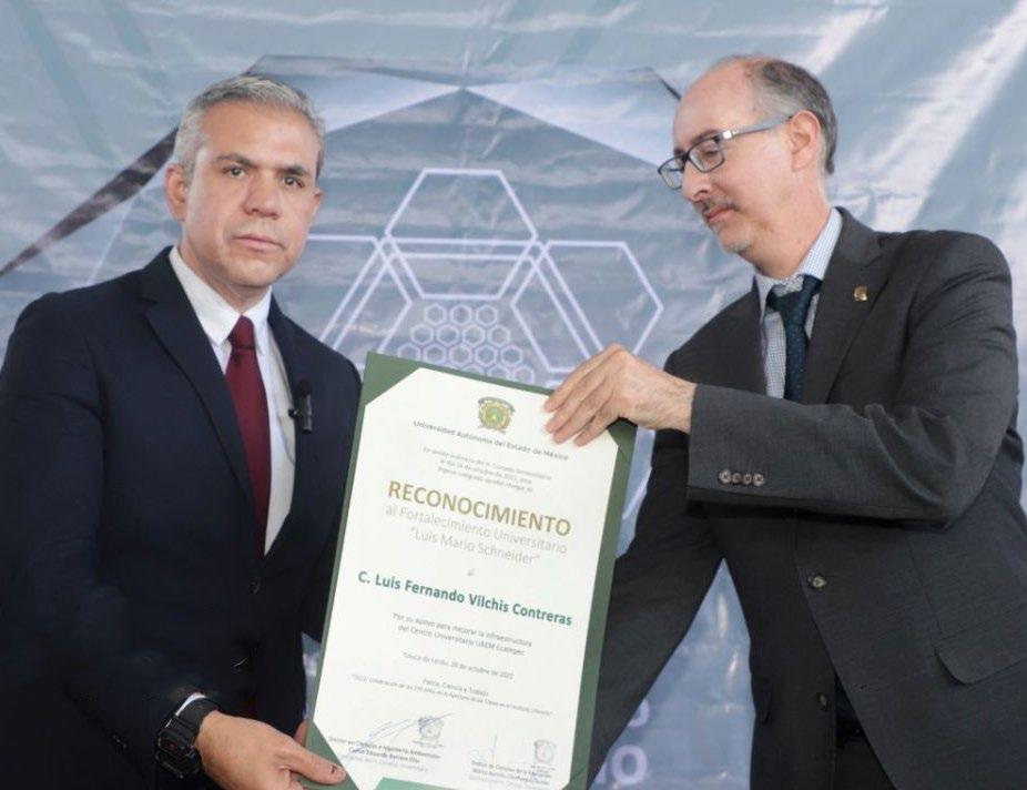 En reconocimiento a las obras realizadas por el gobierno de Ecatepec para el fortalecimiento a la infraestructura educativa en la Universidad Autónoma del Estado de México (UAEM), autoridades de la casa de estudios otorgaron el reconocimiento al Fortalecimiento Universitario “Luis Mario Schneider” al presidente municipal de Ecatepec, Fernando Vilchis Contreras.