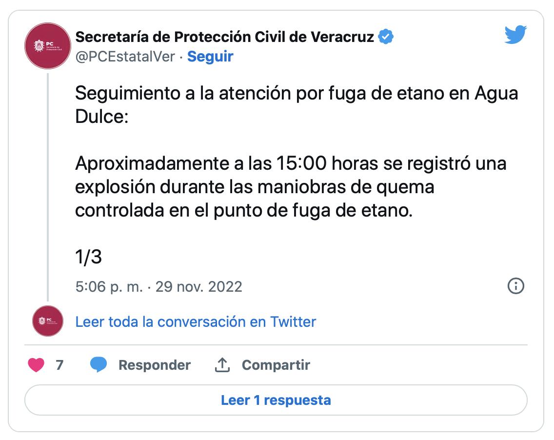 Aproximadamente a las 15:00 horas se registró una explosión durante las maniobras de quema controlada en el punto de fuga de etano” MIÉRCOLES 30 DE NOVIEMBRE DE 2022 15