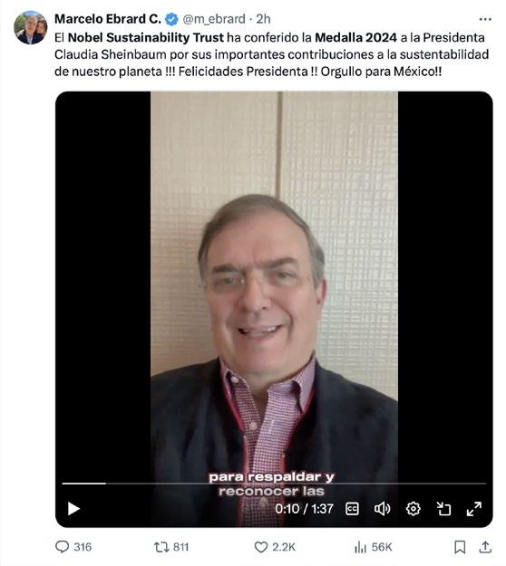 de muy alta jerarquía por sus iniciativas desde la Ciudad de México, precisamente en materia de sustentabilidad, energías renovables, acciones para la mitigación del cambio climático, innovación urbana, muchas iniciativas que tomó”, expuso. Ebrard Casaubon agregó que prueba de ello son los proyectos del Cablebús, el Bosque de Chapultepec y la Central de Abasto, la cual es una de las plantas fotovoltaicas más grandes del mundo. Michael Nobel, fundador del Nobel Sustainability Trust, envió una carta a la mandataria de México el 1 de octubre, en la que le dio a conocer que estaba seleccionada para dicha medalla.