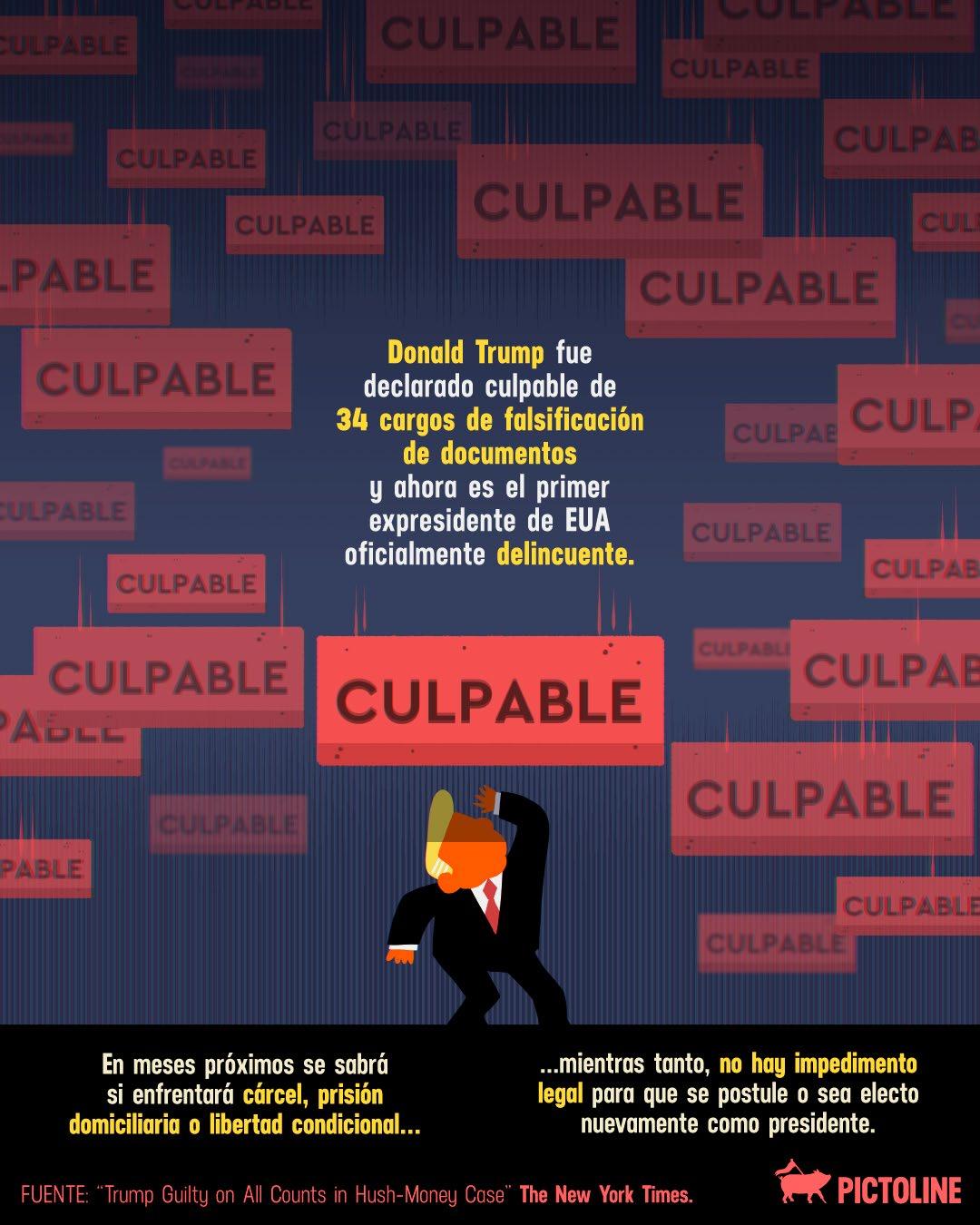 Un jurado de Manhattan declaró culpable a Donald Trump de falsificar registros comerciales en relación con la trama de dinero pagado a Stormy Daniels para ocultar su affaire. El jurado decidió que el magnate es culpable de los 34 cargos imputados a Trump que enfrentaba tras deliberar durante 9.5 horas. Los 34 cargos tienen que ver con falsificación de documentos contables para esconder un pago destinado a silenciar a la exactriz porno Stormy Daniels. Trump permaneció impávido, mientras que en el 15to piso del tribunal se podían escuchar las reacciones de los simpatizantes y detractores reunidos en la calle. El magnate se convierte así en el primer expresidente en la historia de Estados Unidos en ser declarado en una causa penal. El republicano, de 77 años, también se convierte en el primer candidato de un partido importante que se postula a la presidencia siendo declarado un delincuente. El juez Juan Merchán indicó que será el próximo 11 de julio a las 10 de la mañana cuando se dé a conocer la sentencia en contra del republicano; el juzgador agradeció al jurado por sus servicios y les pidió se retirarán del recinto. La defensa de Trump solicitó