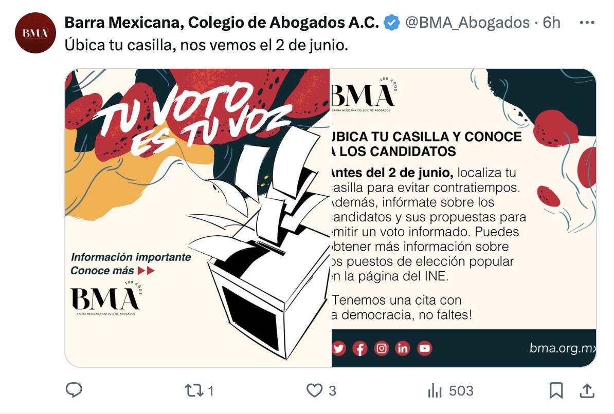 La Barra Mexicana, Colegio de Abogados (BMA) exhortó a la ciudadanía a ejercer responsablemente el derecho al voto, “buscando siempre el pleno respeto a la división de poderes, al fortalecimiento de nuestros órganos constitucionales autónomos y a la independencia