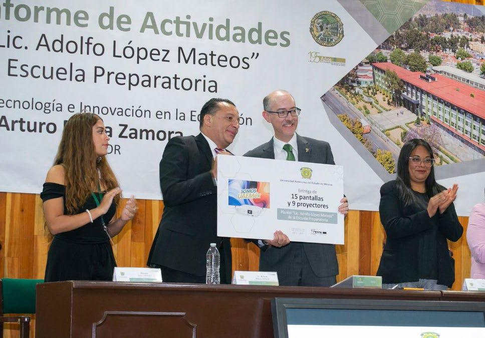 El rector de la Universidad Autónoma del Estado de México (UAEMex), Carlos Eduardo Barrera Díaz, encabezó el primer informe de actividades del director del plantel “Lic. Adolfo López Mateos” de la Escuela Preparatoria, Arturo Mejía Zamora. Durante el evento, entregó 15 pantallas de 65 pulgadas, 9 proyectores y colocó la primera piedra de tres cubículos para el profesorado. Además, comenzaron los trabajos para la remodelación de los sanitarios del tercer piso del plantel “Lic. Adolfo López Mateos” de la Escuela Preparatoria. Barrera Díaz destacó que la entrega de este equipo