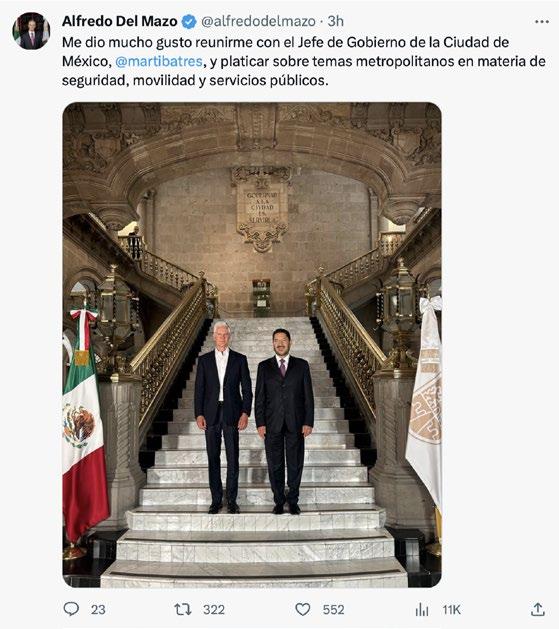 “Me dio mucho gusto reunirme con el Jefe de Gobierno de la Ciudad de México, Martí Batres, y platicar sobre temas metropolitanos en materia de seguridad, movilidad y servicios públicos”, escribió el mandatario mexiquense en sus cuentas de redes sociales.
