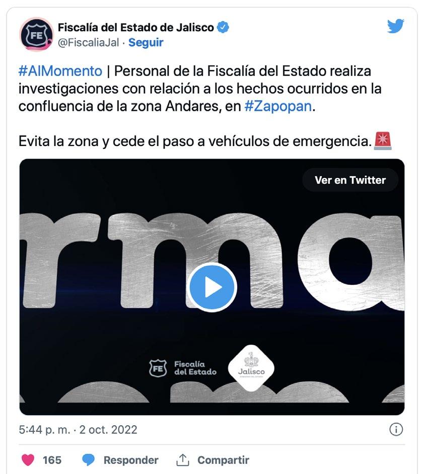 “Personal de la Fiscalía del Estado realiza investigaciones con relación a los hechos ocurridos en la confluencia de la zona Andares, en Zapopan”, publicó la dependencia en Twitter.
