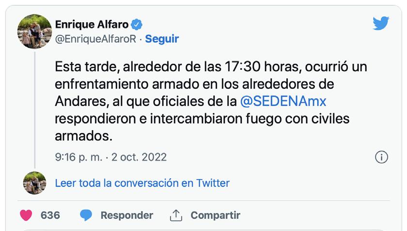 Ayer, alrededor de las 17:30 horas, ocurrió un enfrentamiento armado en los alrededores de Andares, al que oficiales de la SEDENAmx respondieron e intercambiaron fuego con civiles armados.” LUNES 3 DE OCTUBRE DE 2022 13