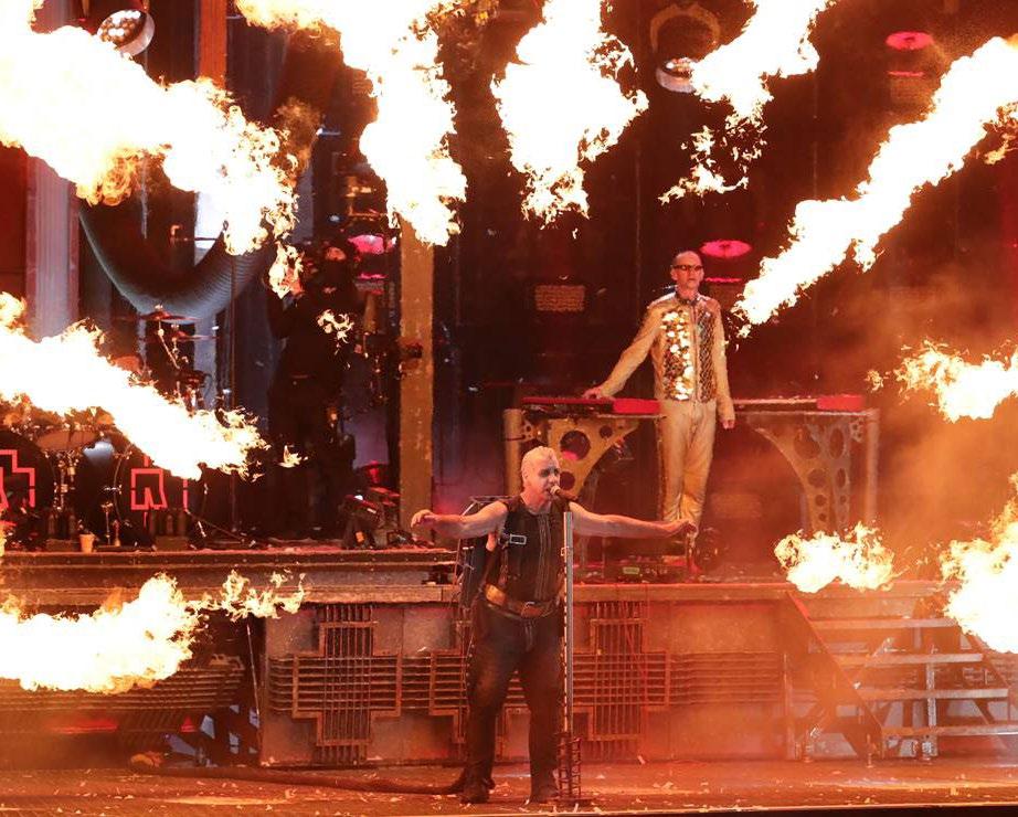 Hay tipos de silencios, como cuando uno es obligado a callar y no queda más que resignarse. Pero hay otros silencios: esos que van calando por el cuerpo hasta que desembocan en un grito; esa espera no es incó moda, sino excitante. Pasaron casi tres años para que Ram mstein provocara la segunda de estas experiencias a 65 mil personas que acudieron al Foro Sol. La pandemia retrasó la visita de los alemanes, por eso a las 20:30 horas hubo lágrimas provocadas por la euforia, mientras se cimbraba el suelo y las gradas con el pri mer estruendo que provocó la batería de Christoph Schneider. A los aficionados los sorpren dió una llamarada de fuegos artificiales que iluminaron sus rostros de bocas abiertas, expresivos en plena bulla. Todo fue ganancia con los riffs de la guitarra eléctrica de Richard