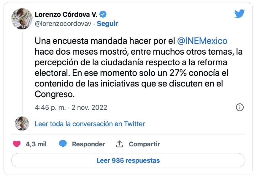 En tanto, el consejero Ciro Murayama resaltó que dos meses después de esa encuesta, “cada vez tiene menos apoyo la idea presidencial de sustituir al INE por otro organismo y menciona que encuestas recientes de dos diarios de circu lación nacional muestran que solo el 13% está de acuerdo en desaparecer al INE y 65% señala que no se necesitan cambios. “Así que la deliberación publica de estos dos meses ha permitido: que con información se conozcan los riesgos de una reforma electoral regresiva sobre la democracia; que se genere una percepción pública más com prometida con la defensa de la autonomía del INE” escribió Murayama en su cuenta de Twitter. Hay que recordar que la encuesta realizada por BGC se efectuó los días 9 y 10 de septiembre a 400 personas mayores de 18 años que contaban con un celular. En su cuenta de Twitter, Lorenzo Cór dova explicó que: