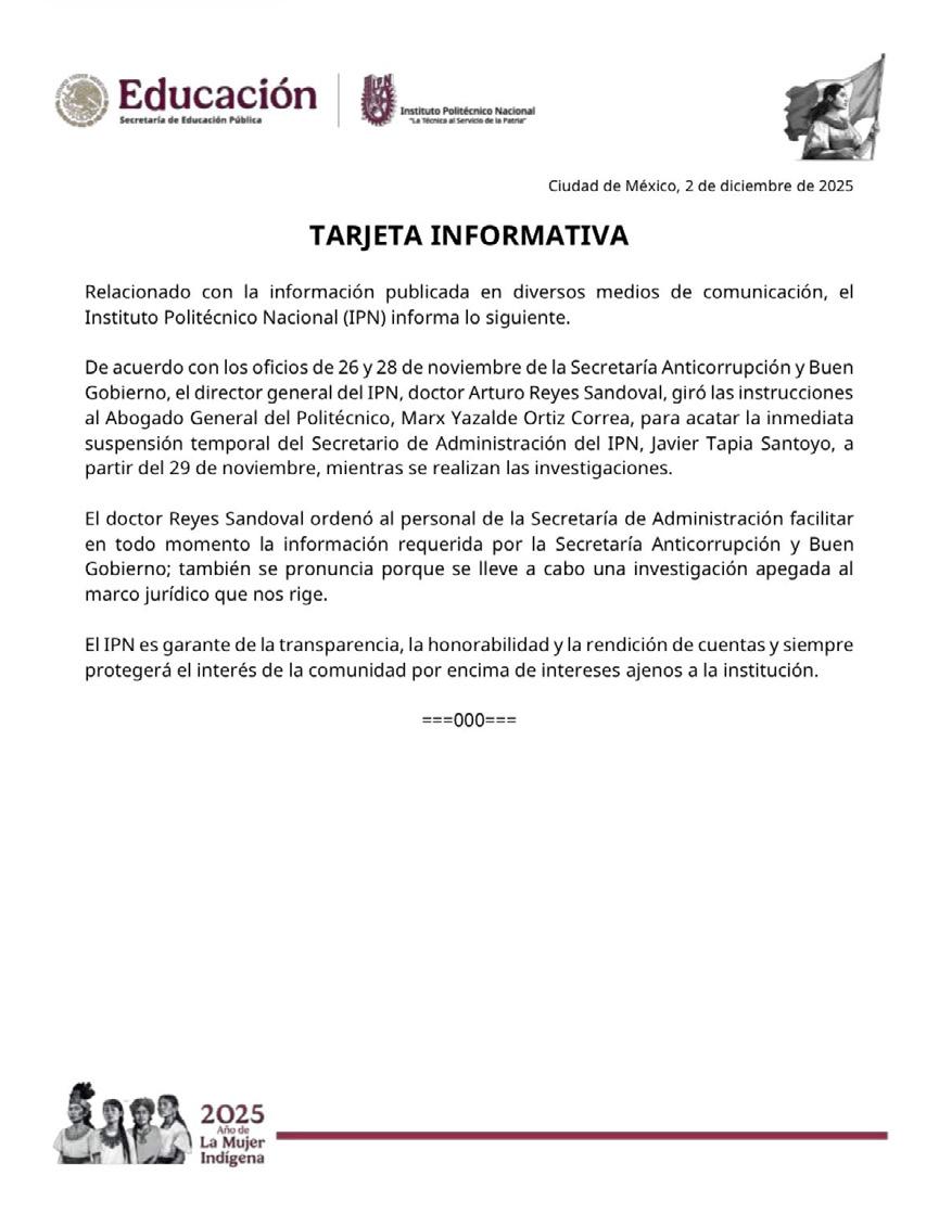 El Instituto Politécnico Nacional (IPN) determinó suspender temporalmente a Javier Tapia Santoyo, secretario de administración, quien fue exhibido tras la presunta comisión de “transas” en contratoas de la institución y en su gestión anterior en el ISSSTE. A través de un comunicado, el IPN detalló que la suspensión contra el directivo está vigente desde el 29 de noviembre, ante la solicitud hecha por la Secretaría Anticorrupción y de Buen Gobierno. “De acuerdo con los oficios de 26 y 28 de noviembre de la Secretaría Anticorrupción y Buen Gobierno, el director general del IPN, doctor Arturo Reyes Sandoval, giró las instrucciones al Abogado General del Politécnico, Marx Yazalde Ortiz Correa, para acatar la inmediata suspensión temporal del Secretario de Administración del IPN, Javier Tapia Santoyo, a partir del 29 de noviembre, mientras se realizan las investigaciones”, se reveló este martes. La Secretaría Anticorrupción pidió la destitución de Tapia Santoyo por presunto desvío de recursos y por ocultar su enriquecimiento. El directivo es investigado por irregularidades en contrataciones de servicios de limpieza del IPN, además de la compra de productos médicos cuando trabajaba como tesorero del ISSSTE.